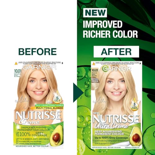 Garnier Nutrisse Ultra Crème Hair Dye with Holly Willoughby, 10.01 Natural Baby Blonde. Enjoy 100% grey coverage and vibrant, long-lasting 8-week colour, with a gentle, no-ammonia formula.