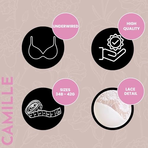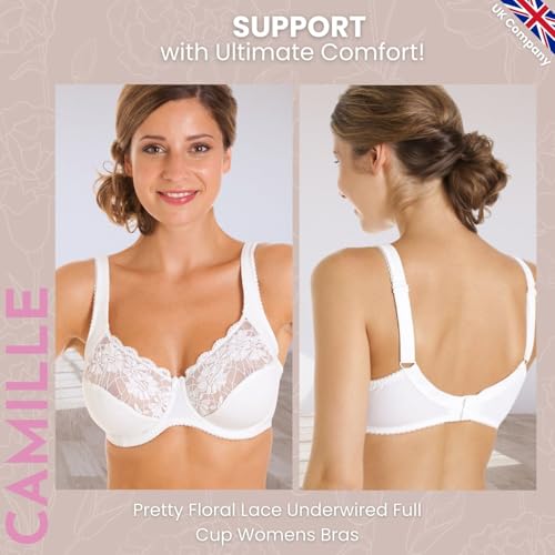 Camille Underwired Lace Full Cup Bras for Women - Womens Bras with Floral Lace Detailing & Adjustable Straps 40E White