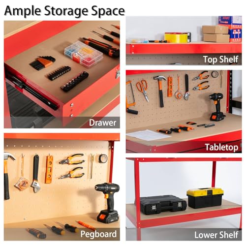 Workbench Workshop Garage Steel Storage Tool DIY Table W/ Pegboard Drawers Red
