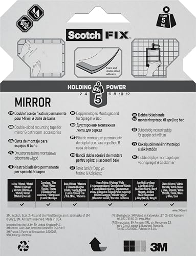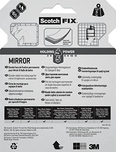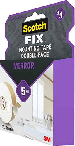 Scotch-Fix Mirror Double-Sided Mounting Tape, 19mm x 5m - For Indoor Use, Humid Areas, For Mirrors in Bathrooms and Kitchens, Works on Ceramic, Tiles, Finished Wood, Metal, Glass and Painted Walls