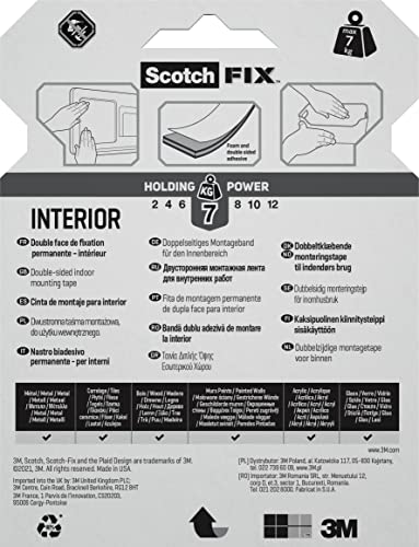 Scotch-Fix Interior Double-Sided Mounting Tape, Strong Bond, White - 1 Roll (19mm x 5m) for Indoor Use on Multiple Surfaces - No Tools Needed - Holds Up to 7 kg