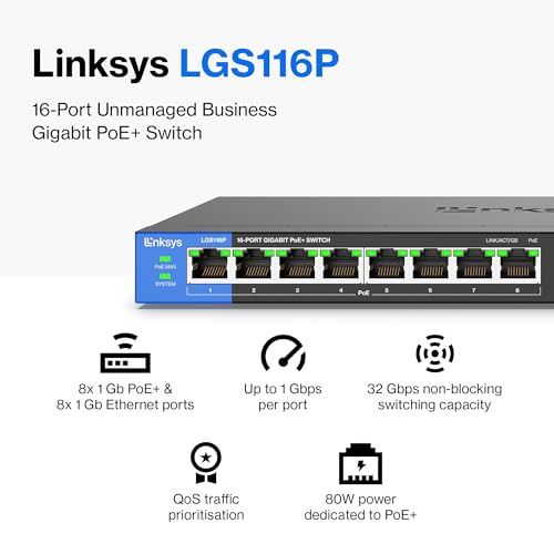 Linksys LGS116P 16 Port Gigabit Unmanaged Network POE Switch with 8 POE+ Ports @ 80W - Ideal for Business, Home, Office, IP Surveillance - Ethernet Switch Hub with Metal Housing, Desktop / Wall Mount