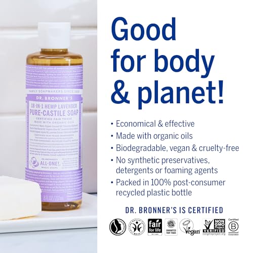Dr Bronner's 18-in-1 Lavender Pure-Castile Liquid Soap, Made with Organic Oils, Used for Face, Body, Hair, Dishes, Mopping and Pets, Certified Fair Trade & Vegan Friendly, 237ml Recycled Bottle