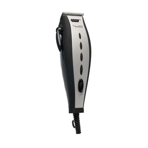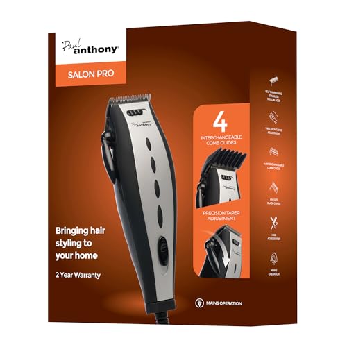 Paul Anthony Salon Pro Corded Hair Clipper - Lightweight - Self Sharpening Stainless Steel Blades - 4 Interchangeable Comb Guides - Precision Taper - Powerful Quiet Motor - Silver & Black - H5120BK