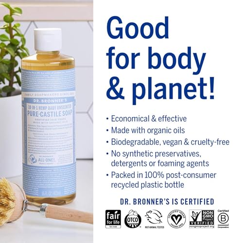 Dr Bronner's 18-in-1 Baby Unscented Pure Castile Liquid Soap, Made with Organic Oils, Used for Face, Hair, Babies, Laundry and Dishes, Certified Fair Trade & Vegan Friendly, 473ml Recyled Bottle