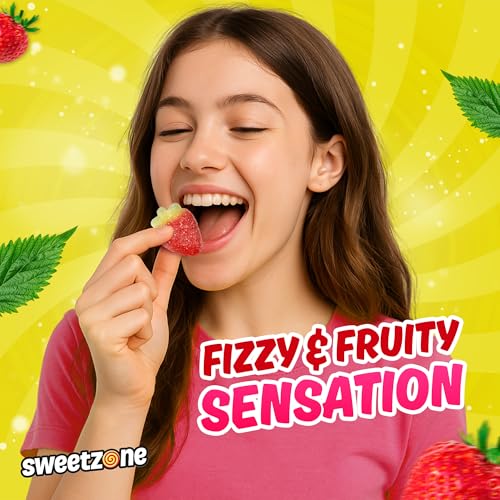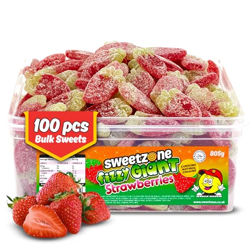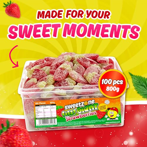 Sweetzone Fizzy Giant Strawberry Gummy Sweets, Fruity Sour Sweets, Halal Sweet Multipack, Bulk Sweet Tubs of Strawberries, Chewy Gummies for Kids, 800g Tub with 100 Gummy Pieces
