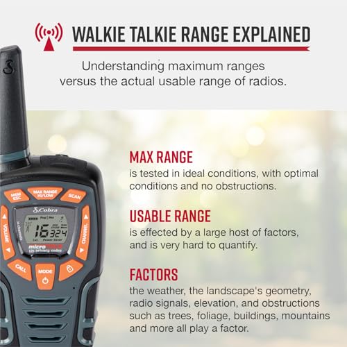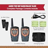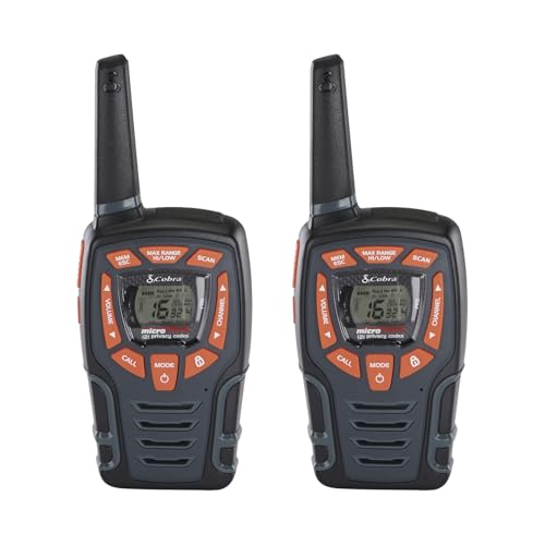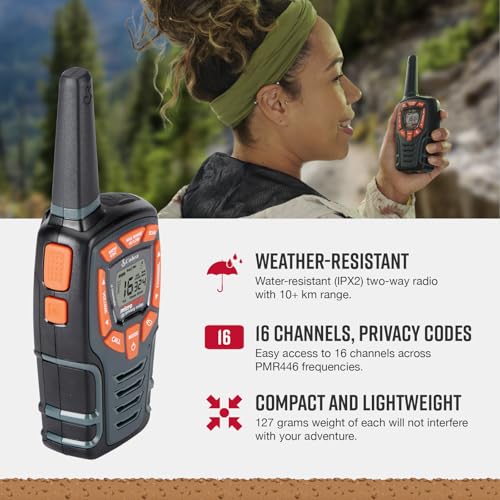 Cobra AM855 Weather Resistant Walkie Talkies (2-Pack) - 10 km Range, 16 Channels and 121 Privacy Codes, Weather Resistant, LED Flashlight, VibrAlert, Rechargeable Two Way Radios, Black
