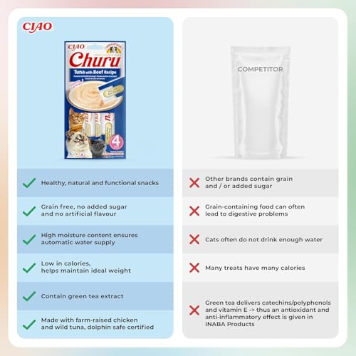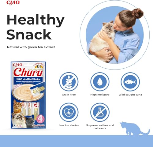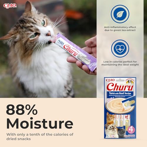 Ciao Churu Sticks by INABA Cat Treat - Tuna & Beef Flavour 12 Pack (48 x 14g total) / Soft & Creamy Cat Treat, Delicious & Healthy Snack, Squeezable Purée Food Topper, Pill Assist, Natural, Grain Free