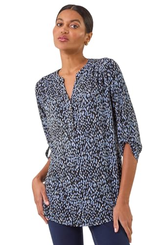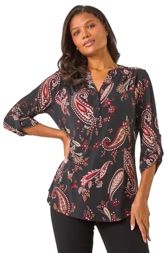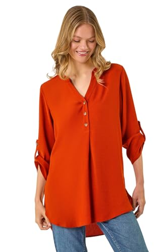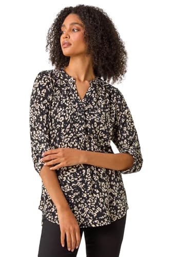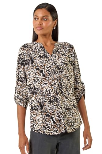 Roman Originals Shirt for Women UK Ladies Top Collarless Blouse Stretchy Tunic Smart Casual Autumn Winter Jersey 3/4 Length Sleeve Notch V Neck Flattering Office Work - Green Camel Black - Size 10
