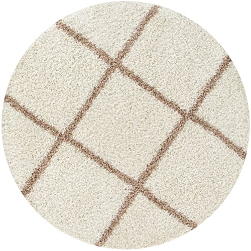 THE RUGS Shaggy Rug – Modern Moroccan Design Rugs for Living Room, Bedroom, Hallway, 3 cm Thick Area Rugs, (Diamond Ivory/Beige, 120cm Round)