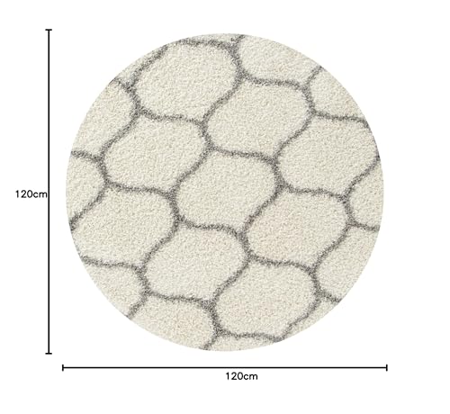 THE RUGS Shaggy Rug – Modern Moroccan Design Rugs for Living Room, Bedroom, Hallway, 3 cm Thick Area Rugs, (Trellis Ivory/Grey, 120cm Round)