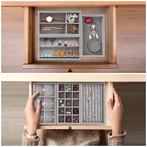 BELLE VOUS 6 Pack of Grey Velvet Stackable Jewellery Organiser Storage Trays - 6 Assorted Drawer Display Boxes - 36 Total Compartments for Necklaces, Rings, Bracelets, Earrings, and More