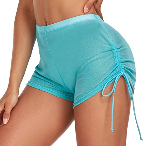 SHERRYLO Swim Shorts Women Sheer Board Short See Through Bikini Bottom Mesh Swimsuit Bottoms Sexy See Thru Bathing Suit, Turquoise, Large