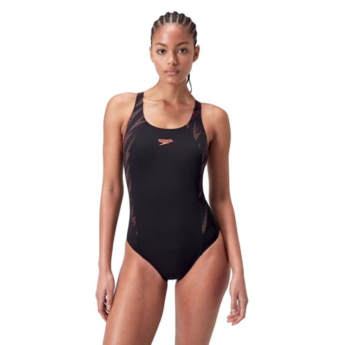 Speedo Women's Hyperboom Splice Muscleback Swimsuit | Classic Design | Quick Drying | Training | Fitness | Chlorine Resistant, Black/Electric Pink/USA Ch, One Size
