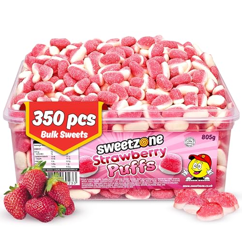 Sweetzone Strawberry Puffs Halal Sweet, Fizzy Fruity Gummies With Wine Gums, Bulk Sweet Sharing Multipack Tubs, Strawberries Gummy Chews, 805g, 350pcs, or Kids, Party Bags, Lunchbox Snacks, Treats UK