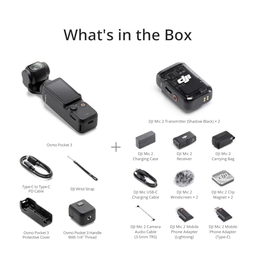 DJI Osmo Pocket 3 + Mic 2 (2 TX + 1 RX + Charging Case), Vlogging Camera with 1'' CMOS & 4K/120fps Video, 3-Axis Stabilization, Fast Focusing, Face/Object Tracking, 2" Rotatable Touchscreen