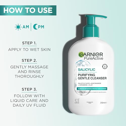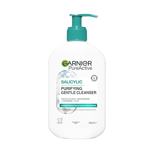 Garnier Pure Active Salicylic Purifying Gentle Face Cleanser, Enriched With Salicylic Acid, Niacinamide, Ceramides & Clay, Fragrance Free, Sulphate Free Formula, Suitable For Sensitive Skin, 250ml