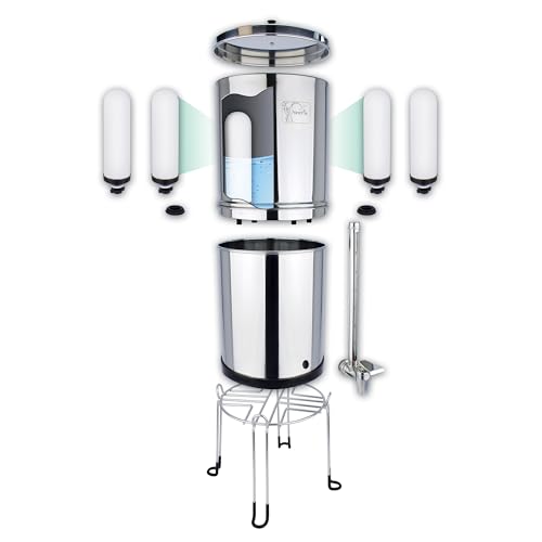 NEWTON Premium Gravity-Powered Water Filter System with Heavy Metal & Fluoride Removal, Reduces Limescale | 12L Capacity | Full System with 4x Filter Candles, Stainless Steel Stand & Sight Glass Tap