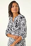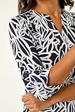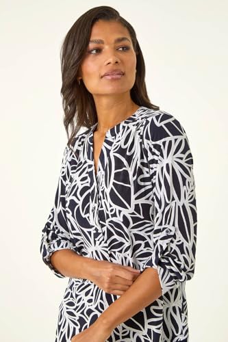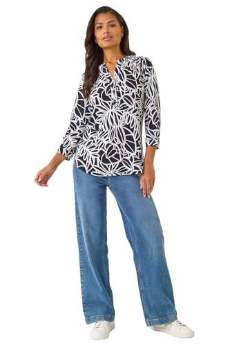 Roman Originals Shirt for Women UK Ladies Top Collarless Blouse Stretchy Tunic Smart Casual Autumn Winter Jersey 3/4 Length Sleeve Notch V Neck Flattering Office Work - Navy Ivory - Size 10