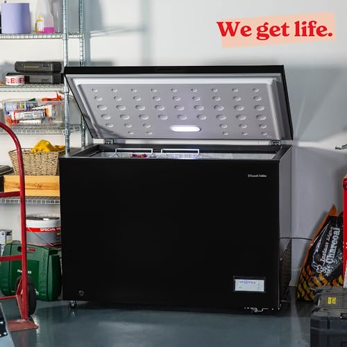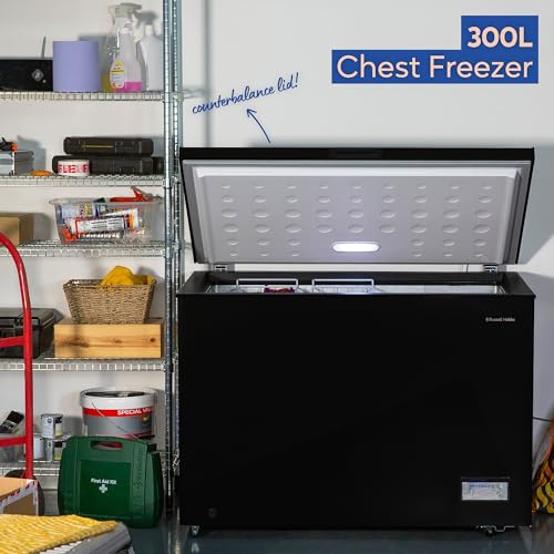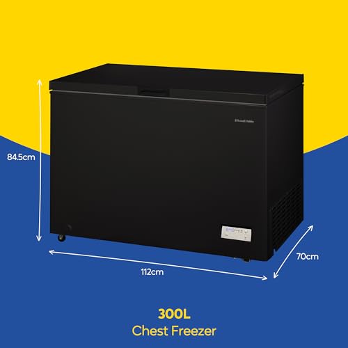 Russell Hobbs Free Standing Chest Freezer, 300 Litres, Low Noise, Garage Safe, Counterbalance Lid, Front Drain Hole, 1.8m Cord, Castor Wheels, 5 Year Registered Guarantee Black, RH300CF201B