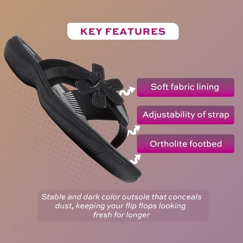 Clarks Womens Breeze Sea Flip-Flop Sandals - Comfortable Flip Flop with Adjustable Hook and Arch Support - Casual Summer Wearing Cloudsteppers for Everyday, Flora Black/Black, 3.5 UK