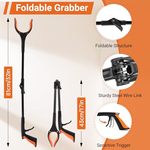THINKWORK 2-Pack Litter Pickers for Adults, 81cm/32" Foldable Grabber Stick for Elderly, Helping Hand Grabber for Disabled, Heavy Duty Pick Up Stick Grabber, Portable Rubbish Picker Grabber (Orange)