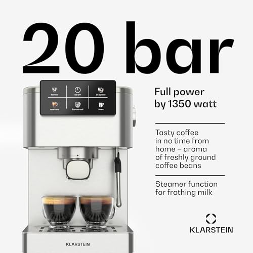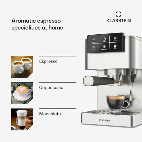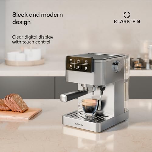 Klarstein SteelPresso Touch Espresso Machine – 20 Bar, 1350W, Stainless Steel, Milk Frother, Touch Display, 1.5L Water Tank, Cappuccino & Latte Maker, Compact Design