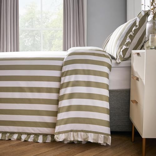 OHS King Size Duvet Covers Stripe Print Frill Edge, Soft Cosy Fabric Timeless Striped Pattern with Frill Edges Stylish King Size Duvet Cover & 2 Pillowcases, Sage