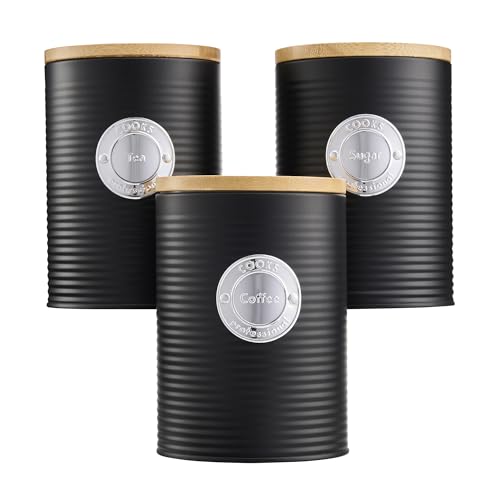 Cooks Professional 3pc Ribbed Tea Coffee & Sugar Storage Canisters with Silver Labels in Black Black