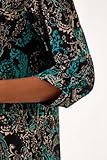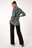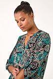 Roman Originals Shirt for Women UK Ladies Top Collarless Blouse Stretchy Tunic Smart Casual Autumn Winter Jersey 3/4 Length Sleeve Notch V Neck Flattering Office Work - Teal Paisley - Size 10