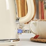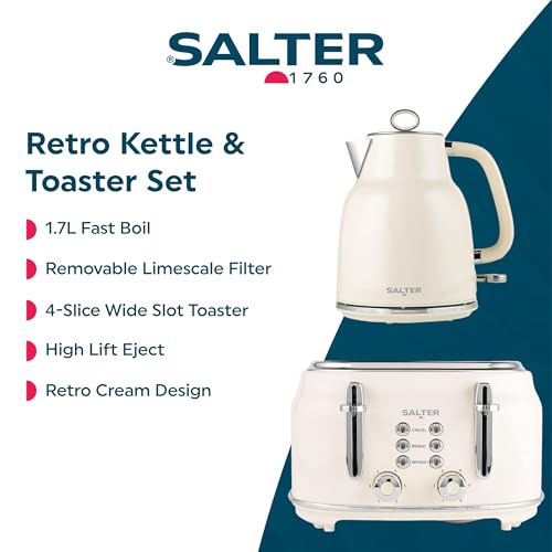 Salter Retro Kettle & Toaster Set – 1.7L Fast Boil Kettle With Removable Limescale Filter, 4-Slice Wide Slot Toaster, Thick Bread, High Lift Eject, Blue Indicator Lights, 3kW/1630W, Cream, COMBO-9352