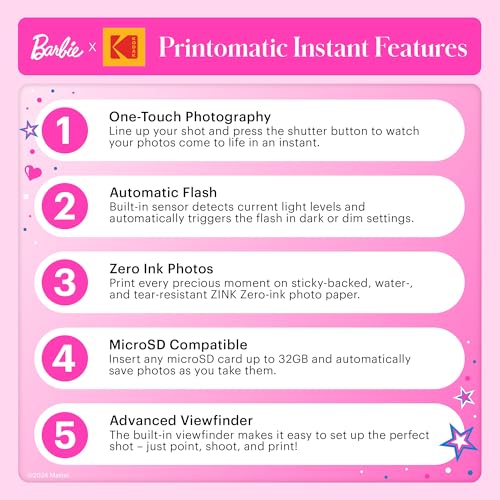 Barbie x Kodak Printomatic Full-Color Instant Print Digital Camera – 5MP Portable Barbie Camera Prints Colorful 2x3” Sticky-Back Photos – Iconic Style