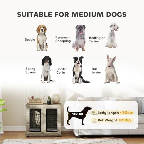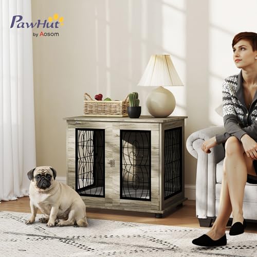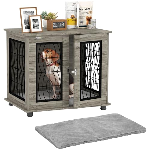 PawHut Dog Crate Furniture, End Table for Medium Dogs w/ Cushion, Grey