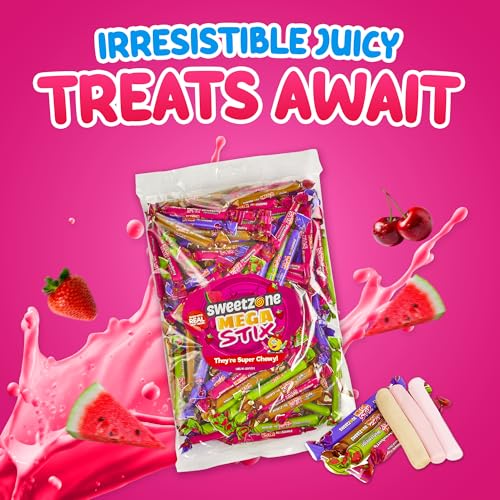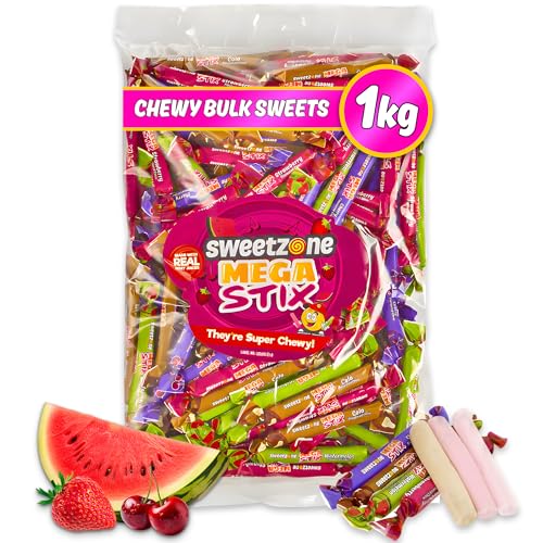 Sweetzone Mega Stix, 1kg Assorted Fruity Flavours Bag of Sweets - Enjoy the Burst of Real Fruit Juices with these Chewy Sweets Fruity Treats Sticks - Halal Candies, Perfect for Kids and Candy Lovers
