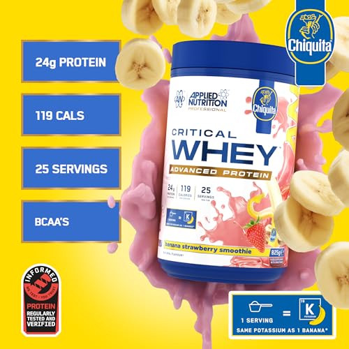 Applied Nutrition Critical Whey Protein Powder – 24g Protein per Serving, High Protein Powder, Protein Shake with BCAAs & Glutamine – Muscle Growth & Recovery (825g - 25 Servings) (Banana Strawberry)
