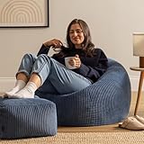 icon Kingston Cord Bean Bag with Footstool, Denim Blue, Large Adult Bean Bag Chair with Filling Included, Comfy Chair, Pouffe Footstool, Living Room Furniture, Bedroom Furniture