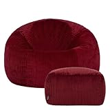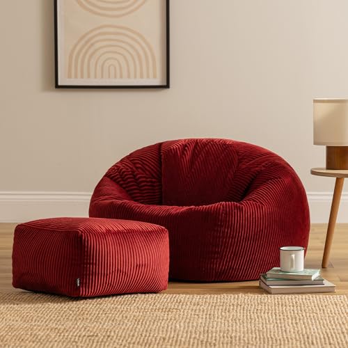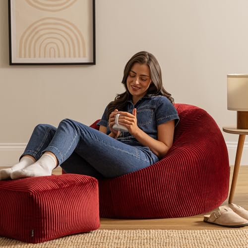 icon Kingston Cord Bean Bag with Footstool, Burgundy, Large Adult Bean Bag Chair with Filling Included, Comfy Chair, Pouffe Footstool, Living Room Furniture, Bedroom Furniture