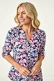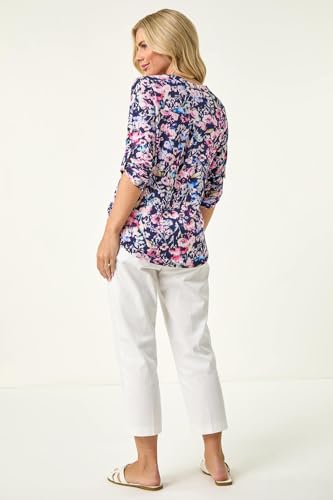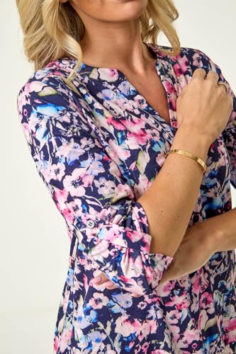 Roman Originals Shirt for Women UK Ladies Top Collarless Blouse Stretchy Tunic Smart Casual Autumn Winter Jersey 3/4 Length Sleeve Notch V Neck Flattering Office Work - Petite Navy Floral - Size 18
