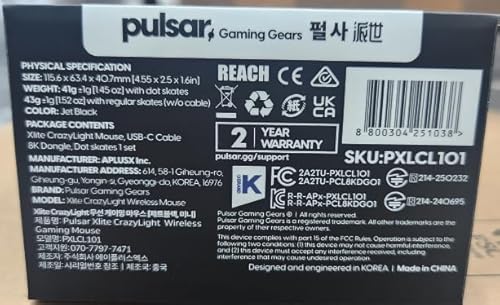 Pulsar Gaming Gears Xlite Crazylight Wireless Gaming Mouse, Ultra Lightweight 1.45 oz (41g), Optical Switch, 32000 DPI, 750 IPS, XS-1 Sensor, 8k Compatible (Jet Black)