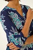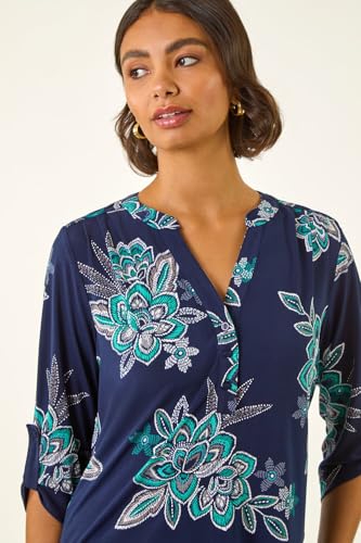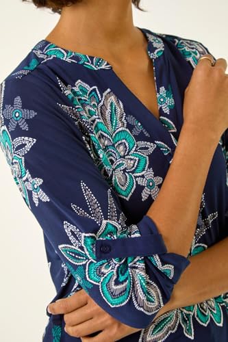 Roman Originals Shirt for Women UK Ladies Top Collarless Blouse Stretchy Tunic Smart Casual Autumn Winter Jersey 3/4 Length Sleeve Notch V Neck Flattering Office Work - Turquoise Navy - Size 16