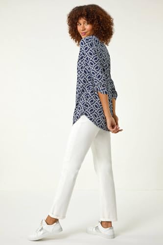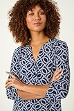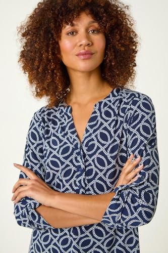 Roman Originals Shirt for Women UK Ladies Top Collarless Blouse Stretchy Tunic Smart Casual Autumn Winter Jersey 3/4 Length Sleeve Notch V Neck Flattering Office Work - Abstract Navy - Size 12
