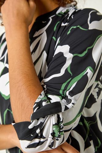 Roman Originals Shirt for Women UK Ladies Top Collarless Blouse Stretchy Tunic Smart Casual Autumn Winter Jersey 3/4 Length Sleeve Notch V Neck Flattering Office Work - Floral Black - Size 10