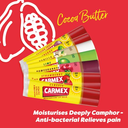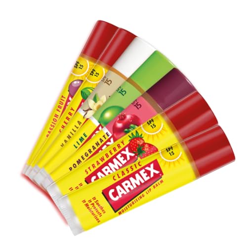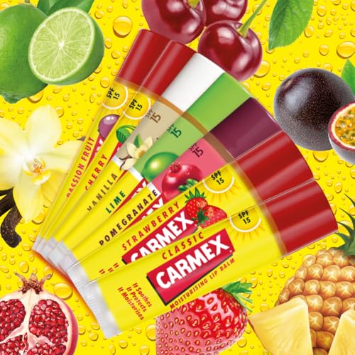 Carmex Moisturising Lip Balm Variety Pack | SPF 15 Sun Protection | Classic, Strawberry, Pomegranate, Lime, Vanilla, Cherry, Passion Fruit | Soothes & Protects Lips | Intensely Hydrating (Pack of 7)