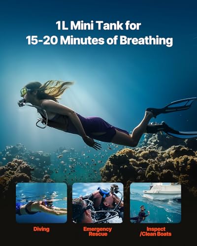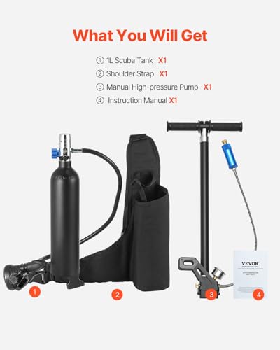 VEVOR Scuba Tank, 1L Portable Diving Tank, Dive Oxygen Cylinder Support 15-20 Minutes Underwater Breathing, 98.43 ft Diving Depth, Refillable Snorkel Air Tanks with Pump for Underwater Exploration