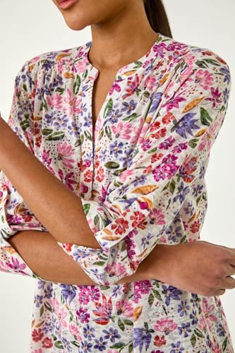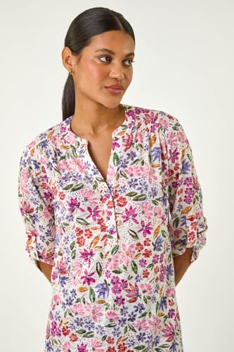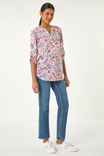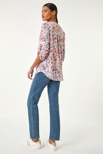 Roman Originals Shirt for Women UK Ladies Top Collarless Blouse Stretchy Tunic Smart Casual Autumn Winter Jersey 3/4 Length Sleeve Notch V Neck Flattering Office Work - Floral Pink - Size 10