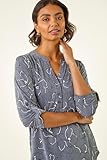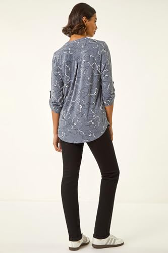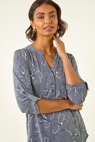 Roman Originals Shirt for Women UK Ladies Top Collarless Blouse Stretchy Tunic Smart Casual Autumn Winter Jersey 3/4 Length Sleeve Notch V Neck Flattering Office Work - Floral Grey - Size 18