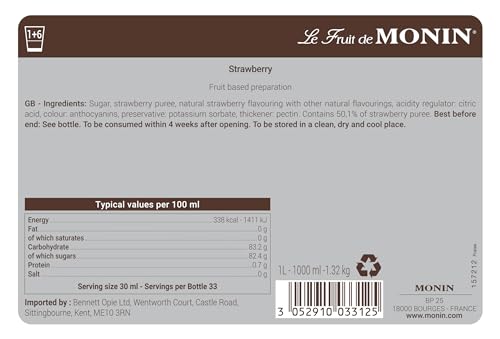 MONIN Strawberry Fruit Mix Puree 1L for Cocktails, Smoothies and Mocktails. Vegan-Friendly, Allergen-Free, 100% Natural Flavours and Colourings. 2-in-1 Strawberry Puree and Sugar Syrup Hybrid