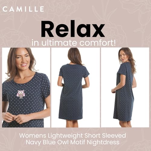 Camille Womens Nightdresses Smooth Soft 100% Cotton - Short Sleeved Breathable & Lightweight Summer Nighties - Blue owl - 10-12
