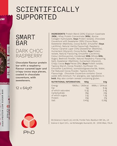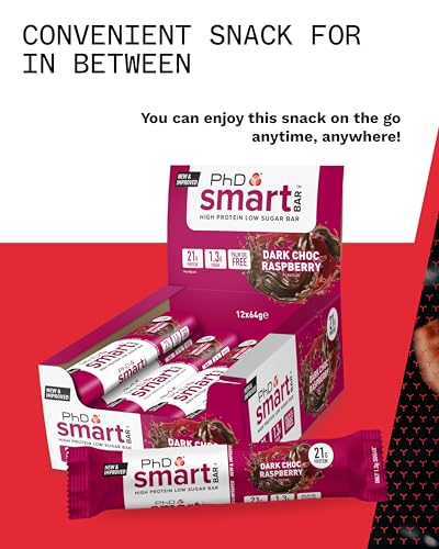 PhD Smart Hight Protein Bar Low Sugar, Nutritional Protein Bars/Protein Snacks, Chocolate Raspberry Flavour, 20g of Protein, 64g Bar (12 Pack)