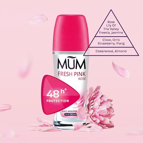 Mum Fresh Pink Rose Perfumed Roll On Deodorant, 48 Hours Plus Protection, Alcohol Free Womens Deodorant, Anti-Perspirant, Vegan, Sustainable Glass Bottle, Rose Fragrance, 50 ml, Pack of 6